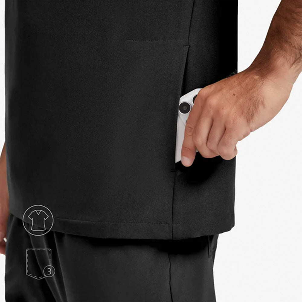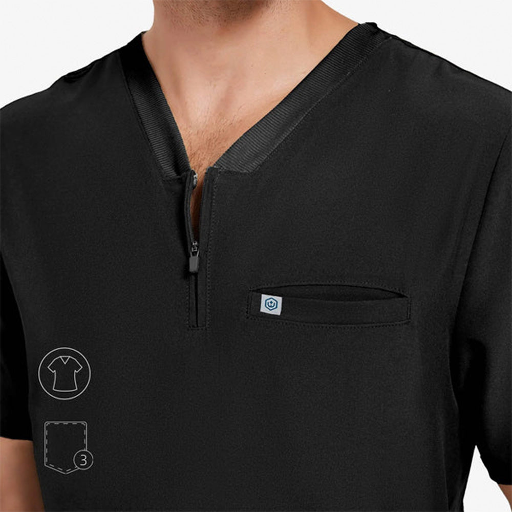 Esta clásica blusa médica para hombre presenta un cuello en V con una cremallera corta que le da un aspecto estilizado y una mayor funcionalidad. El detalle de tela Pit-Stripe en el cuello le aporta un toque contemporáneo.